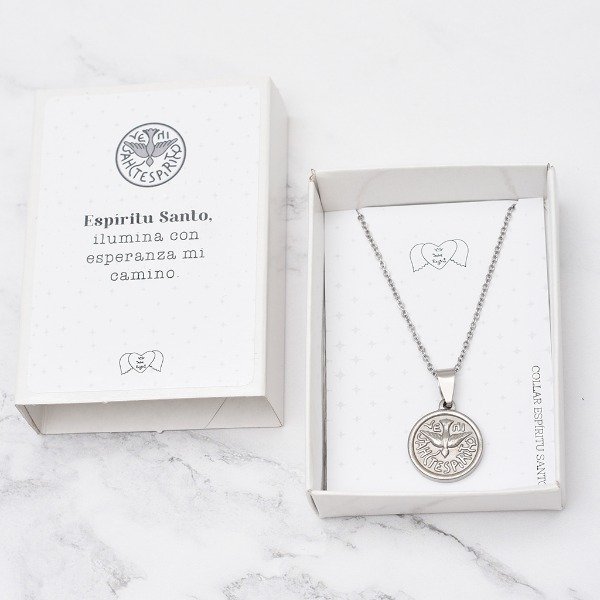 Conjunto de cadena y medalla con la imagen del Espíritu Santo súper delicado. es un modelo unisex. Regalo ideal para Confirmación o Bautismo. Un recuerdo para guardar ♥ Incluye tarjeta con frase: "Espíritu Santo, ilumina con esperanza mi camino". Medida: 45 cm.