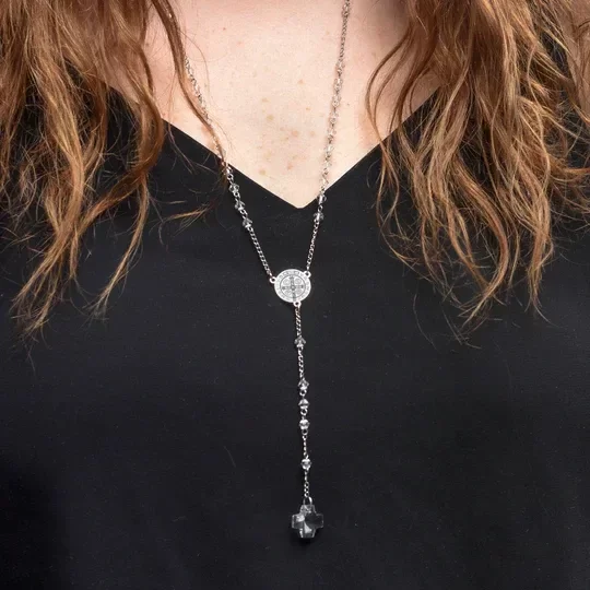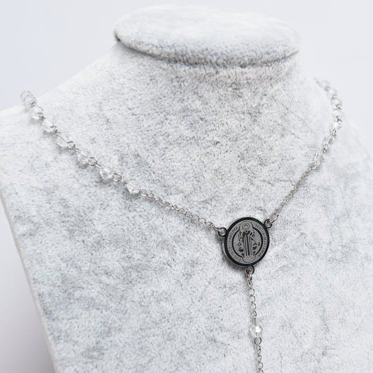 Rosario de estilo largo de acero, con cuentas y cruz de cristales y centro de San Benito. Es un modelo súper canchero, que va para el día y la noche. Viene presentado en una lata grande hermosísima perfecto para regalar🎁
