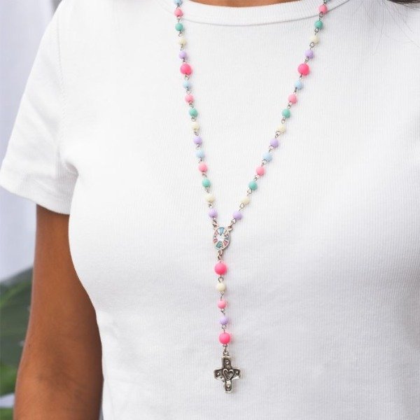 Rosario artesanal de cuentas de material siliconado, con centro del Espíritu Santo y cruz calada♥ Los colores del rosario evocan los colores de los caramelos Sugus! Es ideal como regalo de Confirmación, Comunión, también para hacerle un obsequio a una nena o adolescente!