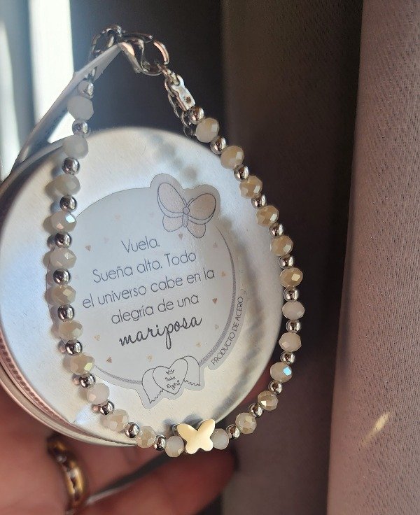 Pulsera de cristales nude con aurora boreal muy delicados y acero quirúrgico. Tiene un dije pequeño de una mariposa, también en acero. ¡Es un regalito divino🎁!