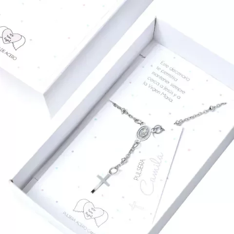 Pulsera decenario de cadena fina de acero, con centro de San Benito y dije de cruz. Los decenarios acompañan las oraciones del rosario, y son una hermosa manera de tener siempre cerca a Jesús y a la Virgen María, ya que el rezo de este busca honrarlos.