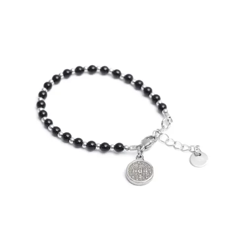 Que no te falte nunca protección con nuestra Pulsera San Benito, con cuentas de piedra y un encantador dije, todo realzado con piezas de acero quirúrgico.