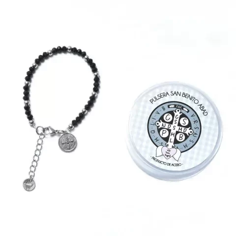 Adentrate en la esencia de la protección con nuestra pulsera de cuentas de acero y cristal, acompañada de un dije de acero con la imagen de San Benito en un lado y la cruz en el otro.