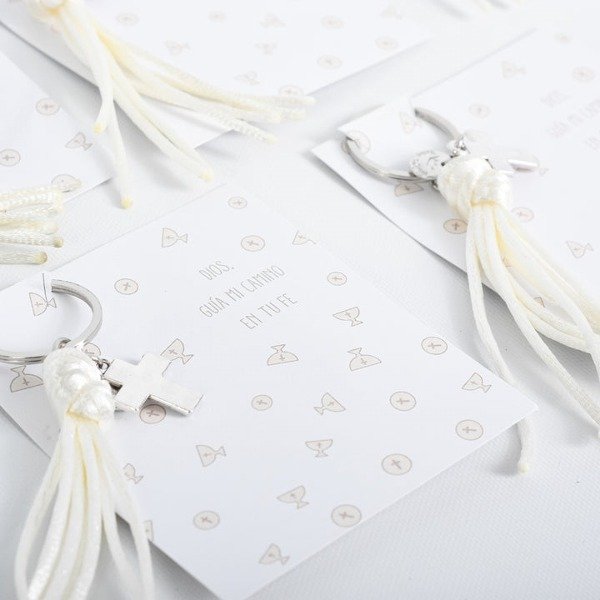 Llaverito con dije de cruz y flecos de hilo de seda al tono con la estampa con diseño de cáliz y hostias