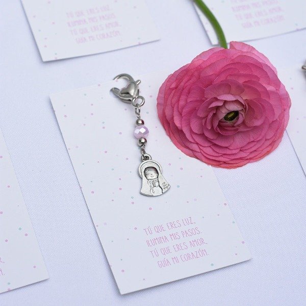 Souvenir tipo bendición con gancho mosquetón con corazón, cristal en color rosa y dije de la Virgencita Niña.