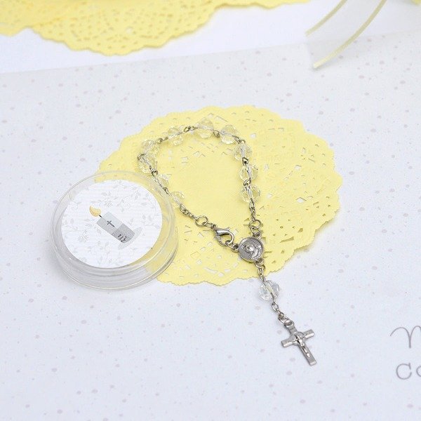 Souvenir decenario de cuentas de cristal con cruz. El decenario tiene un centro de Virgen Niña de un lado y del otro a Jesús Misericordioso. Puede utilizarse como pulsera o para el espejo retrovisor del auto, etc. Viene presentado en una hermosa cajita con diseño de velita.