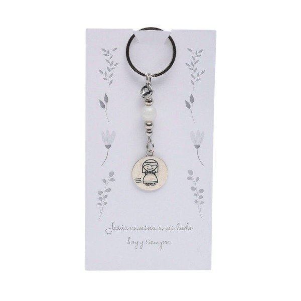 Souvenir de tipo mini llavero. Incluye tarjeta con frase: "Jesús camina a mi lado hoy y siempre. " Viene listo para entregar en tu evento. Ideal para Comunión.