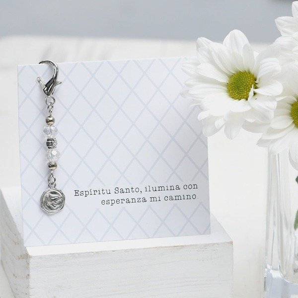 Souvenir de tipo mini bendición. Incluye tarjeta con frase: "Espíritu Santo, ilumina con esperanza mi camino". Viene listo para entregar en tu evento. Ideal para comunión, bautismos, confirmaciones. Es de cristales transparentes con una medalla del Espíritu Santo.